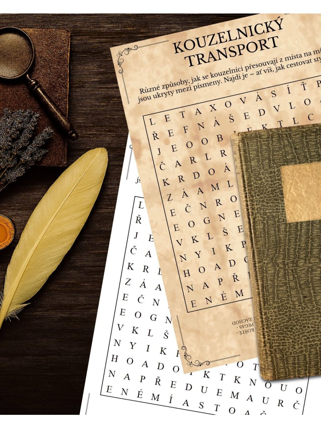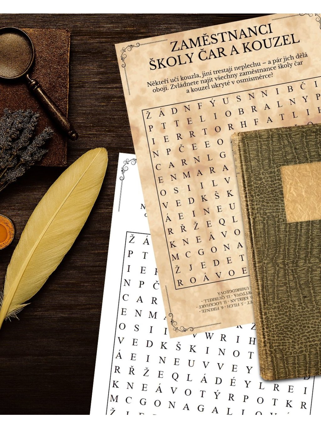 - 🧙♂️ 15 tematických PDF osmisměrek: Magická zvířata a jiná stvoření, Lektvary, přísady a rostliny, Kouzelnický transport, Družstva kouzelnického sportu, Místa v kouzelnickém světě, Škola čar a kouzel, Kouzelnické předměty, Stoupenci zla, Mudlovská osmisměrka, Zaměstnanci školy čar a kouzel
