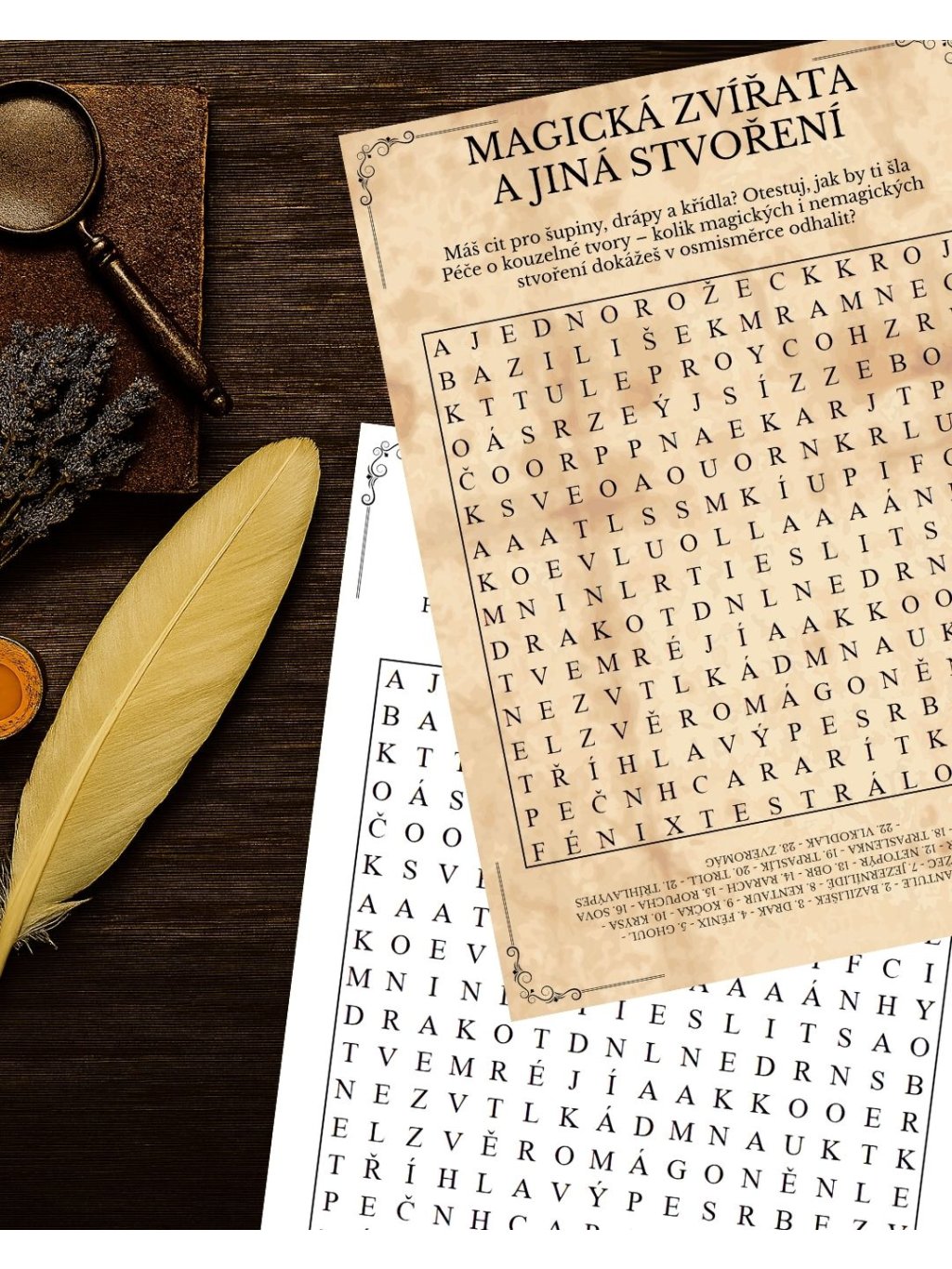 - 🧙♂️ 5 tematických PDF osmisměrek: Magická zvířata a jiná stvoření, Lektvary, přísady a rostliny, Kouzelnický transport, Družstva kouzelnického sportu, Místa v kouzelnickém světě