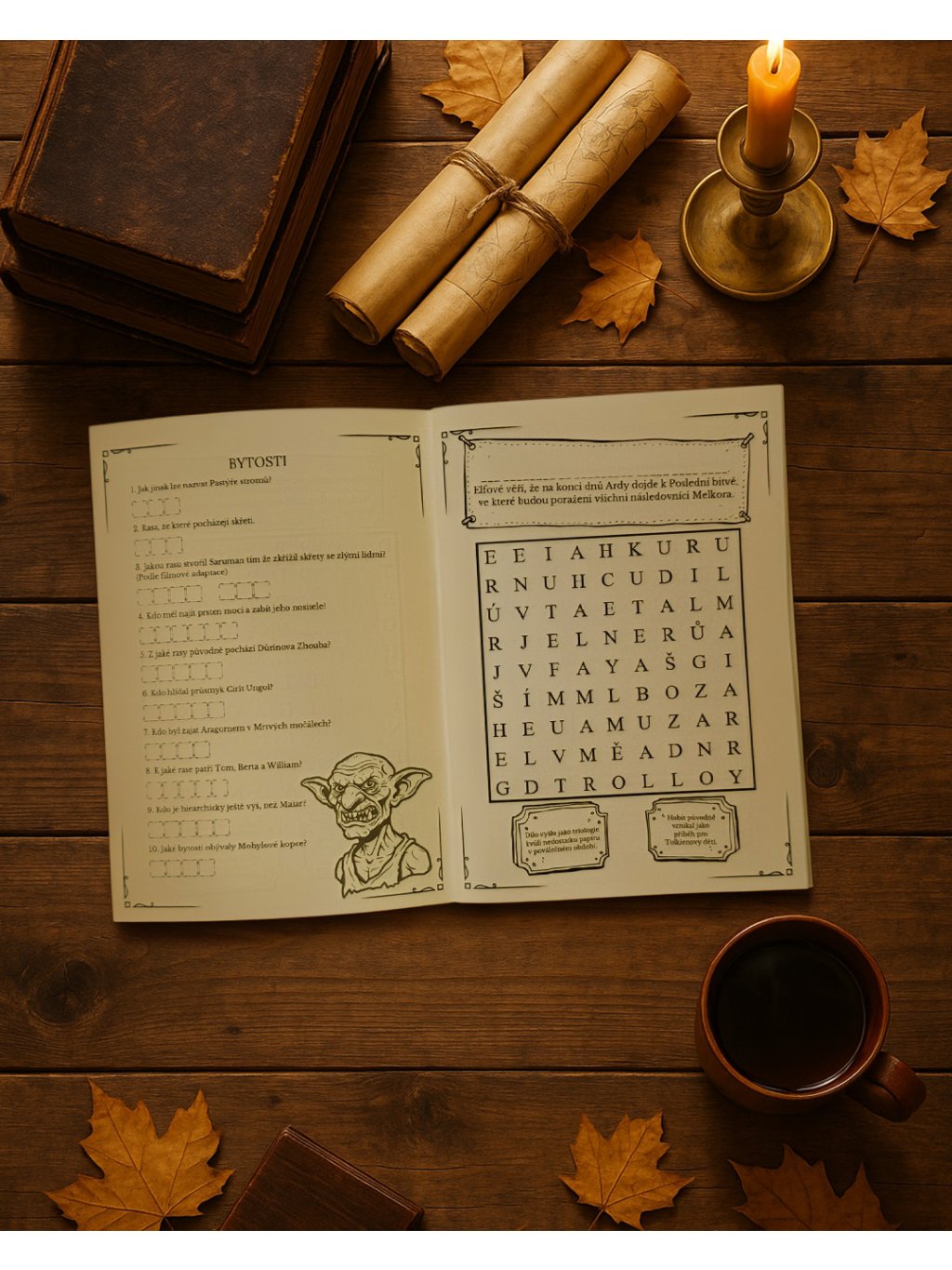 Unikátní brožura, která spojuje kvízy a osmisměrky v jednom. Odpovíte na otázku a odpověď musíte najít i mezi písmeny v osmisměrce. Každá stránka vás zavede jinam: do koutů Středozemě, mezi slavné postavy nebo předměty.